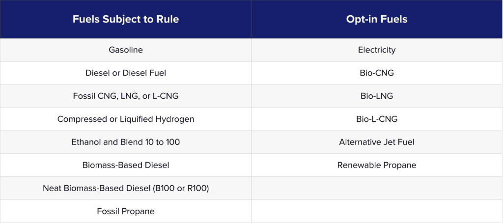 Under the CFS, there are certain fuel types subject to regulation as well as specific opt-in fuels, as shown in the table below.