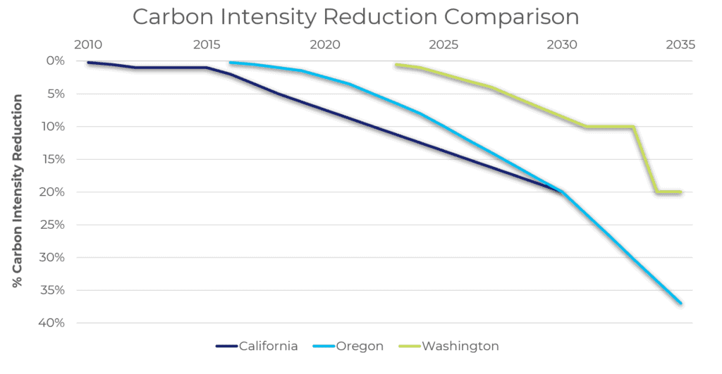 Washington State implemented its Clean Fuel Standard (CFS) on January 01, 2023—becoming the third state to launch a market-based transportation emissions program following California in 2011 and Oregon in 2016. The goal of Washington’s program is to gradually reduce the carbon intensity (CI) score of transportation fuels by 20% (based on 2017 levels) by 2034.